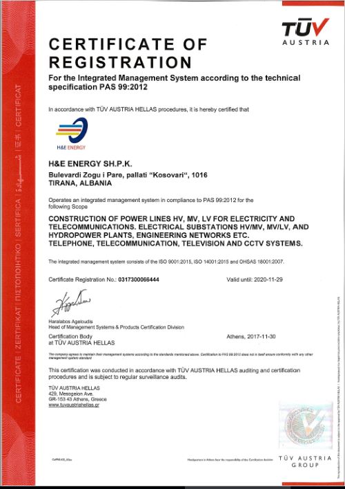 TÜV AUSTRIA Albania përfundoi me sukses çertifikimin e kompanisë “H & E Energy” sh.p.k, në përputhje me kërkesat e standardeve ndërkombëtare ISO 9001:2015, ISO 14001:2015 dhe OHSAS 18001:2007. H & E Energy, kompani ndërtimi e linjave elektrike dhe telekomunikacionit, u bë pjesë e portofolit të madh të TÜV AUSTRIA Albania.