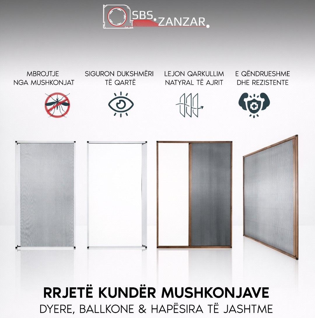 SBS ZANZAR ofron sisteme rrjetash të dizajnuara për dritare dhe dyer, të përshtatshme si për përdorim shtëpiak ashtu edhe për biznes. Këto sisteme mbrojnë ambientet e brendshme nga insektet, papastërtitë dhe mbeturinat, duke garantuar pastërti dhe komoditet. Cilësia dhe përkushtimi mbeten elementët që e dallojnë kompaninë dhe e kanë shoqëruar në rritjen e saj të vazhdueshme.