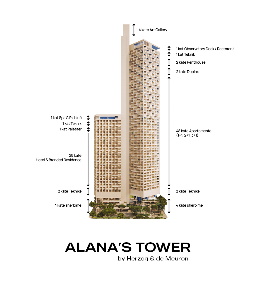 Në përputhje me vizionin e saj për të sjellë zhvillime të nivelit të lartë, Klar prezanton “Alana’s Tower by Herzog & de Meuron”, një nga projektet më ambicioze dhe më të veçanta që pritet të ndërtohen në Tiranë. E pozicionuar në Bulevardin e Ri*, kjo godinë synon të transformojë në mënyrë të ndjeshme panoramën urbane të kryeqytetit, duke sjellë një standard të ri në arkitekturën shqiptare.
