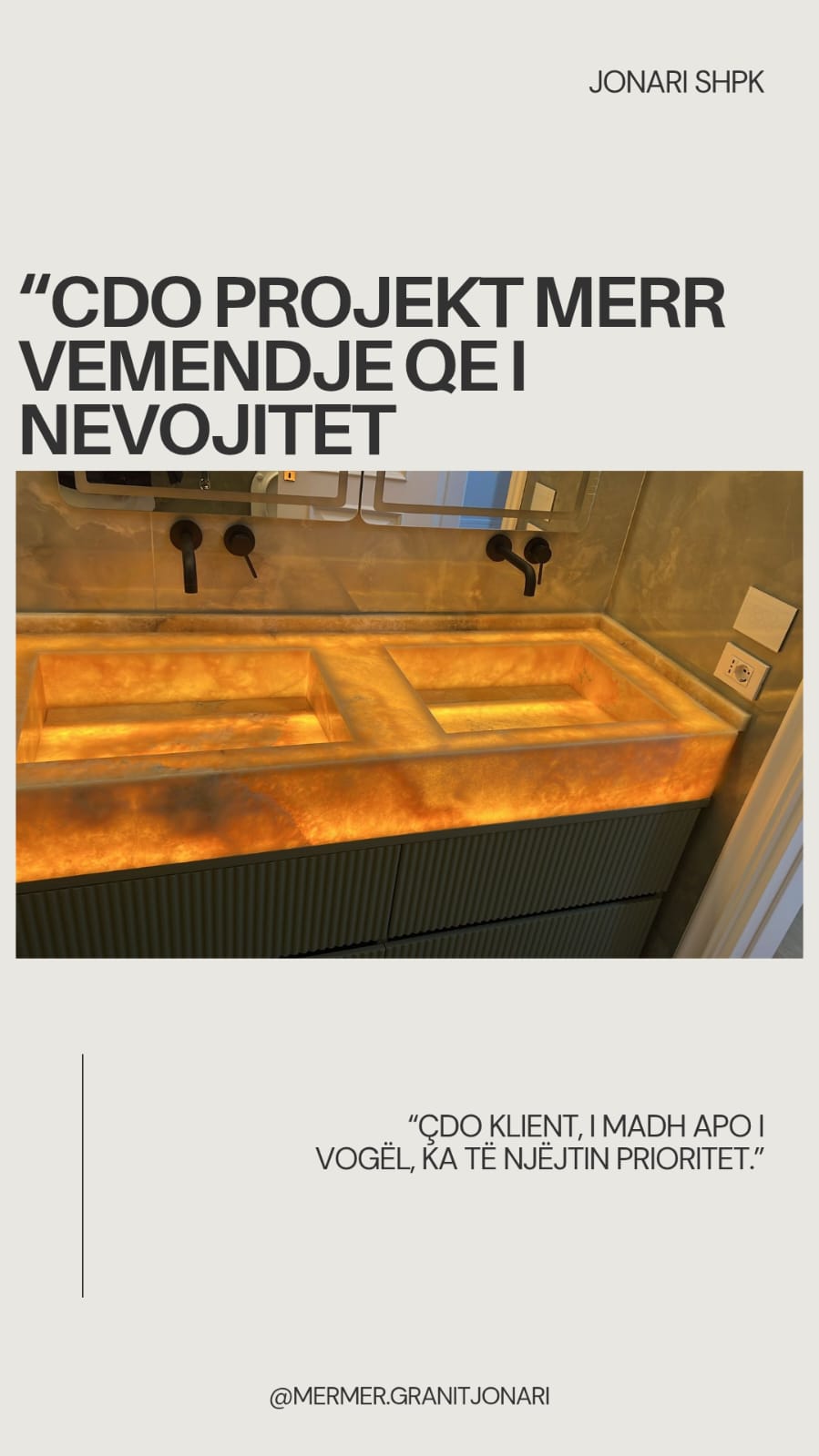JONARI Sh.p.k është kompania lider në Shqipëri për përpunimin dhe punimet e mermerit, granitit dhe kuarcit, duke sjellë zgjidhje të personalizuara dhe me cilësi të lartë për çdo ambient. Nga lavamanët elegantë te dyshemetë e qëndrueshme, kuzhinat bashkëkohore dhe banjot luksoze, ne ofrojmë një gamë të plotë shërbimesh që përputhen me shijet dhe kërkesat specifike të klientëve tanë.